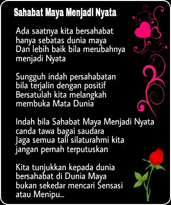 Zaman berzaman telah berlalu, kisah sahabat ada selalu, setia bersama kini dan dulu, tetap seiring bila diperlu. Sejati berkongsi suka dan duka, tawa seia tangis diseka, sakit dirasa bila terluka, ria dirai tanda sama suka. Biar pun jauh hidup terpisah, rindu ketemu resah gelisah, hanyalah doa terus dicurah, tanda ikatan jujur dan pasrah.… Contoh Syair Persahabatan 1. Sumber: Passing Grade. Hai sahabat ayo diingat. Kita bersua hanya tuk sesaat. Tapi kau akan tetap ku ingat. Dalam hati dengan amat sangat. Bila lain waktu kita bertemu. Dan kau telah bersama kawan baru. Janganlah lupakan aku.
